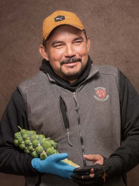 Pedro Sánchez Galindo lives with his family in Santiago Ixcuintla, a town near Tepic and close to the ocean in the Mexican state of Nayarit. Each August, he travels north to work the Brussels sprouts harvest. “We’re out in the fi elds—cutting, knocking down, and grinding the stalks with the sprouts. We start at seven in the morning and fi nish around three-thirty or four in the afternoon.” When the cold and rain arrive, the work gets even harder. “The plants get frosty, but you still have to harvest them…” Pedro admits he feels lonely here. He misses his three children. But it brings him joy to know that his family “eats well in Mexico—that I can give them what, at one point, they might have lacked: food and a little home.” His children are in school, and he hopes they fi nish their studies. “So they won’t have to come like I did—to work in the cold. I want them to be educated and well established.”