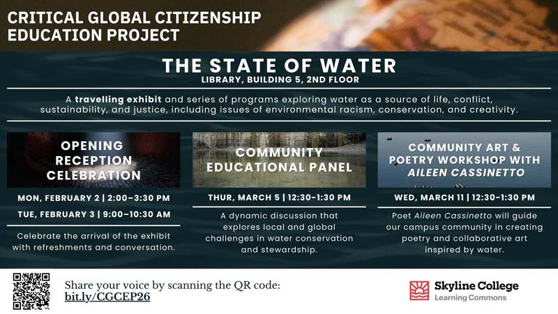 Throughout the exhibit’s run, we invite the community members to submit original poetry and art on the theme of water. These works will be brought together as a community installation, which will be exhibited in the Skyline College Library throughout the Spring 2026 semester and after the traveling State of Water exhibit departs in March. If you have questions about submitting original art and poetry, please contact Pia Walawalkar – Outreach and Equity Librarian.