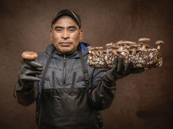 Cornelio is grateful to this land for the job that allows him to send money to his family in Oaxaca. “This is my work: mushrooms,” he says, holding a cylinder of sawdust sprouting edible fungi. “The block arrives, and when it gets warm, the mushrooms grow. We harvest them, clean the block, inject it with water, and it produces again. It takes a lot of care.” Back in Oaxaca, Cornelio worked “a bit in the fi elds and a bit in construction,” but it wasn’t enough. Four years ago, he told his wife he was going north. “I’m a farmworker, and I don’t want my children to suffer like I did. That’s been my dream since I left my village—and it still is.” He takes pride in his job, which he calls “a blessing from God.” There’s always work, and that makes him happy. He supports four children and wants “to give them an education and help them move forward.” “Here, I’m alone—but one day, I’ll go back to see them. That’s my other dream.”